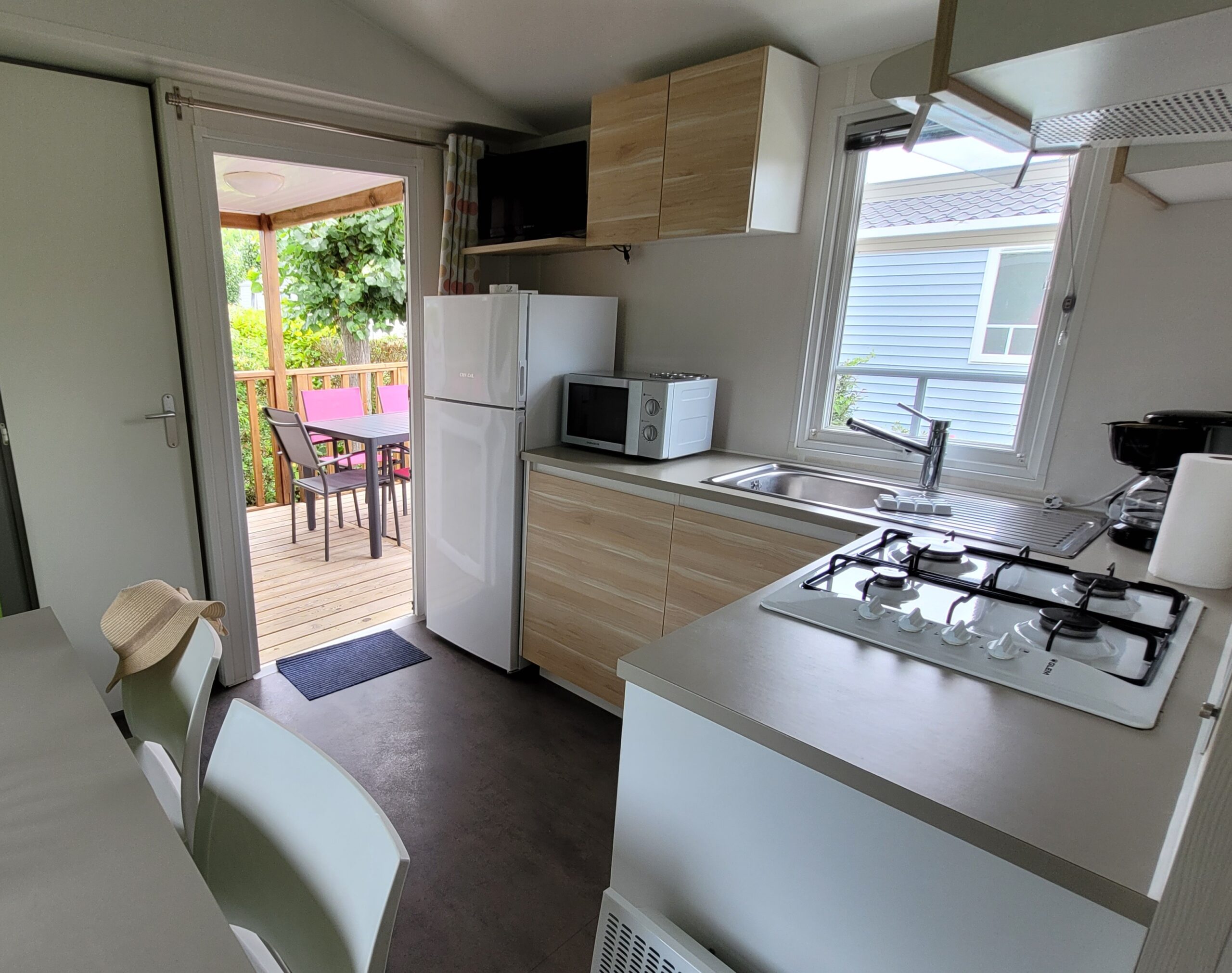 Coin cuisine, gaz 4 feux, évier, réfrigérateur avec compartiments congélateur, micro-ondes, cafetière et bouilloire électriques, grille-pain.